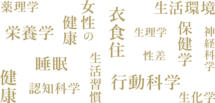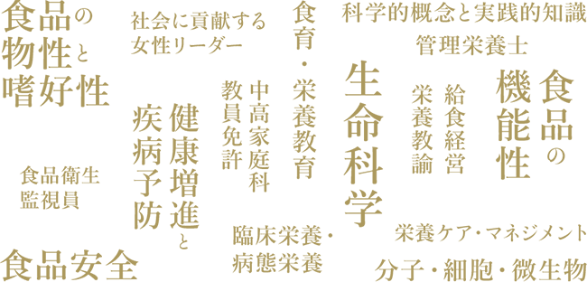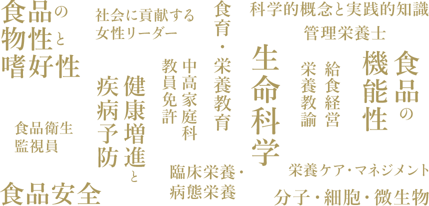 食からの健康増進・疾病予防という観点から、食物の栄養性・機能性・嗜好性・安全性・食環境などに関し、ライフサイエンスを基礎とした教育・研究を行っています。