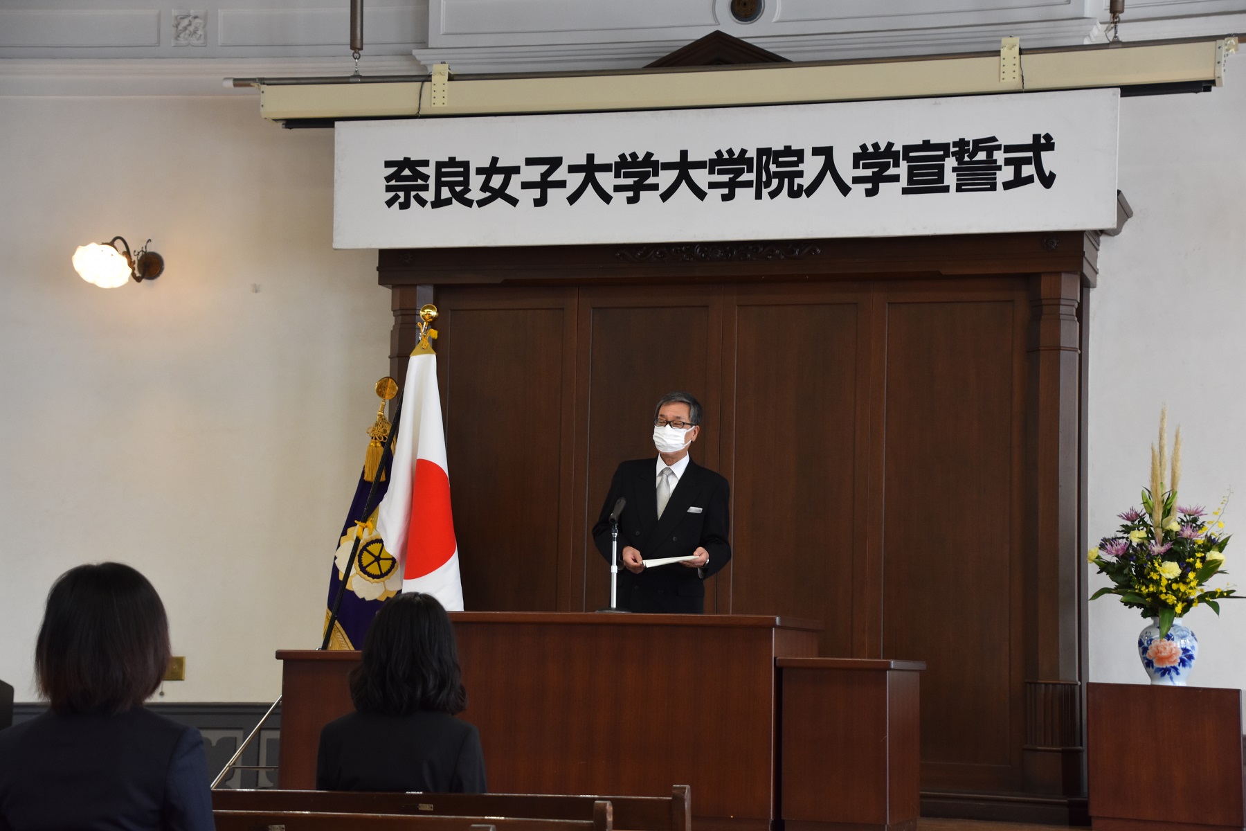 皆様、奈良女子大学の大学院人間文化総合科学研究科にご入学おめでとうございます。大学の教職員一同は、皆さまのご入学を歓迎いたします。また、本日の皆さまのご入学をお喜びのご家族、ご親族の方々に心からお祝い申し上げます。入学者は博士前期課程9名、博士後期課程1名で、合計10名です。
