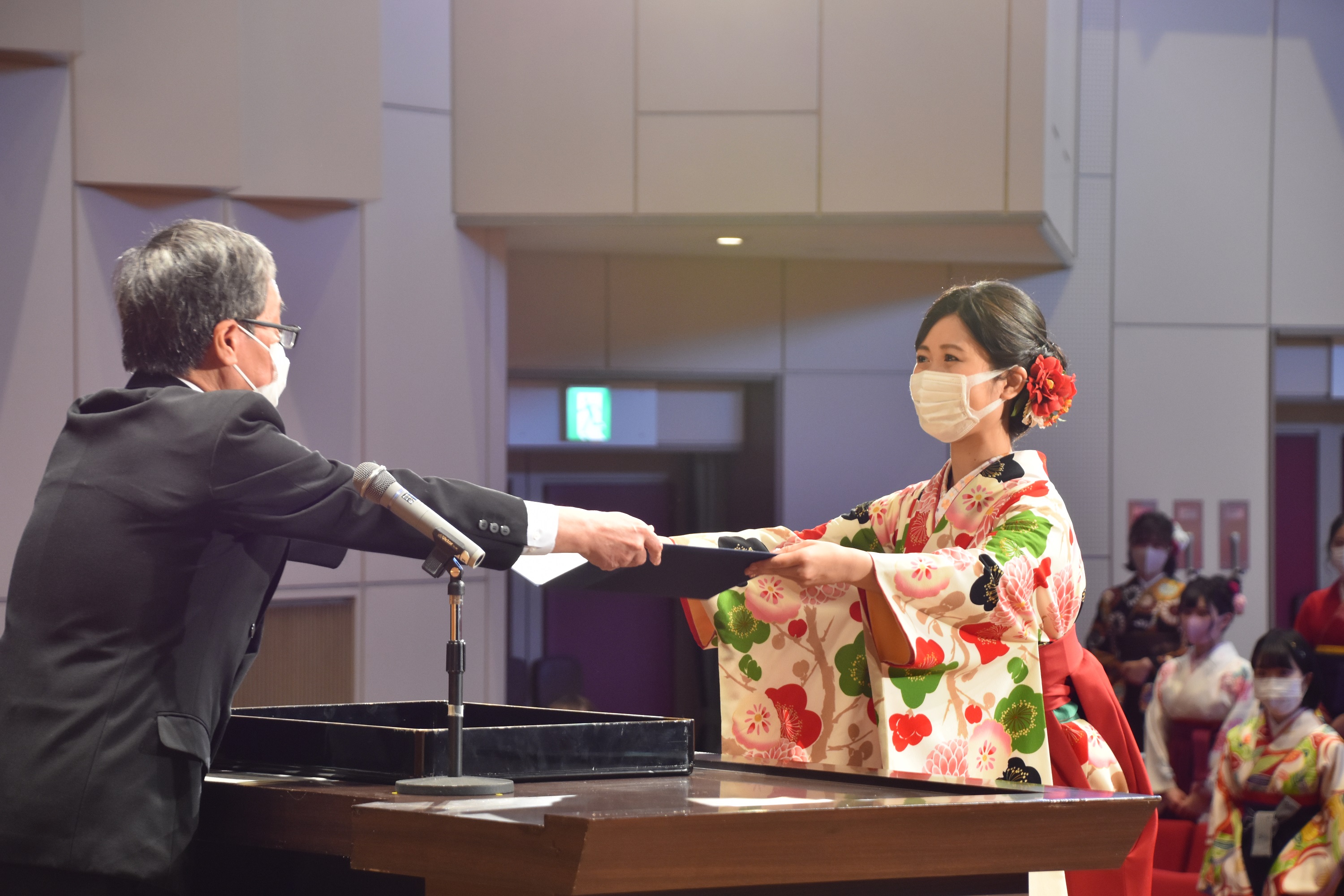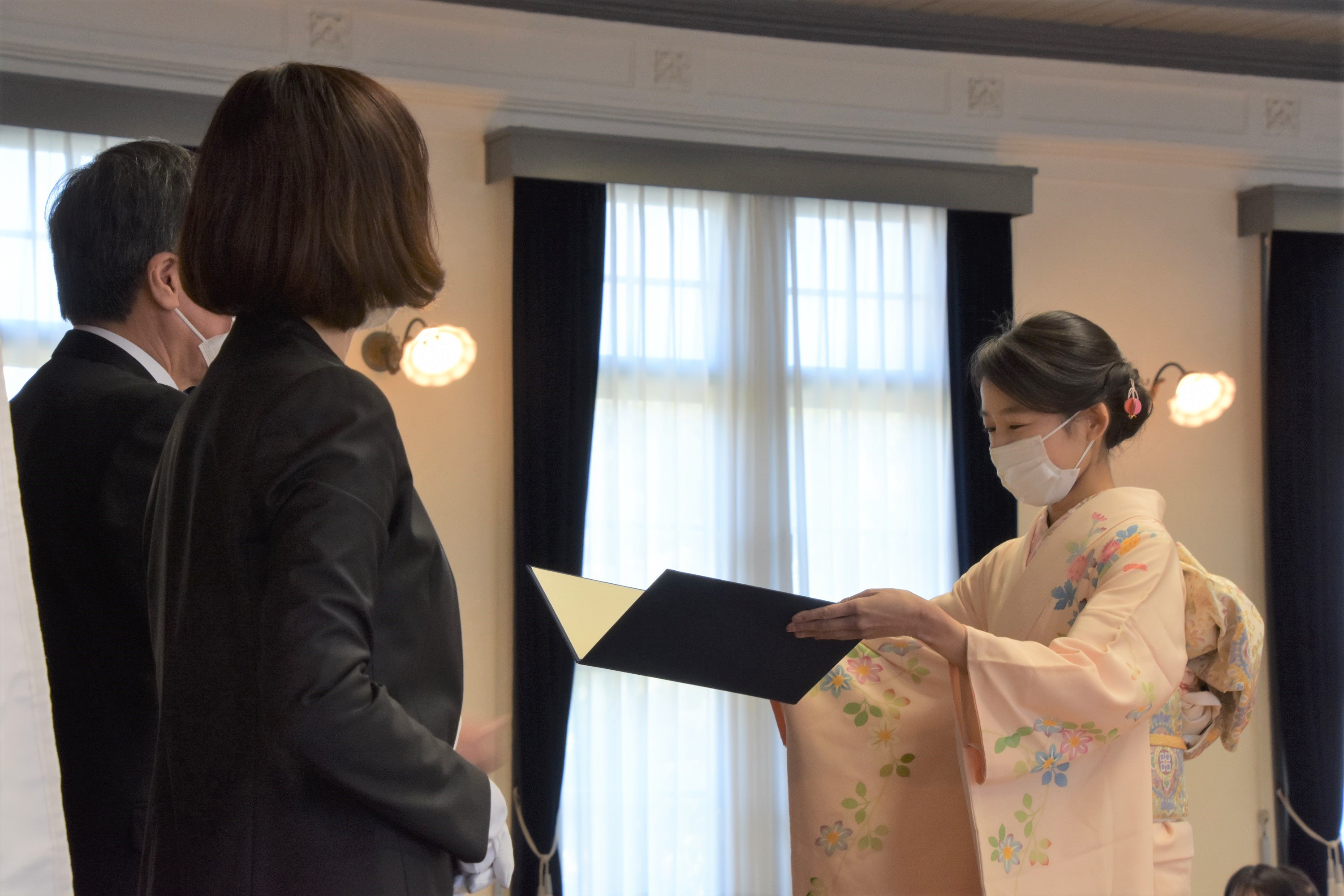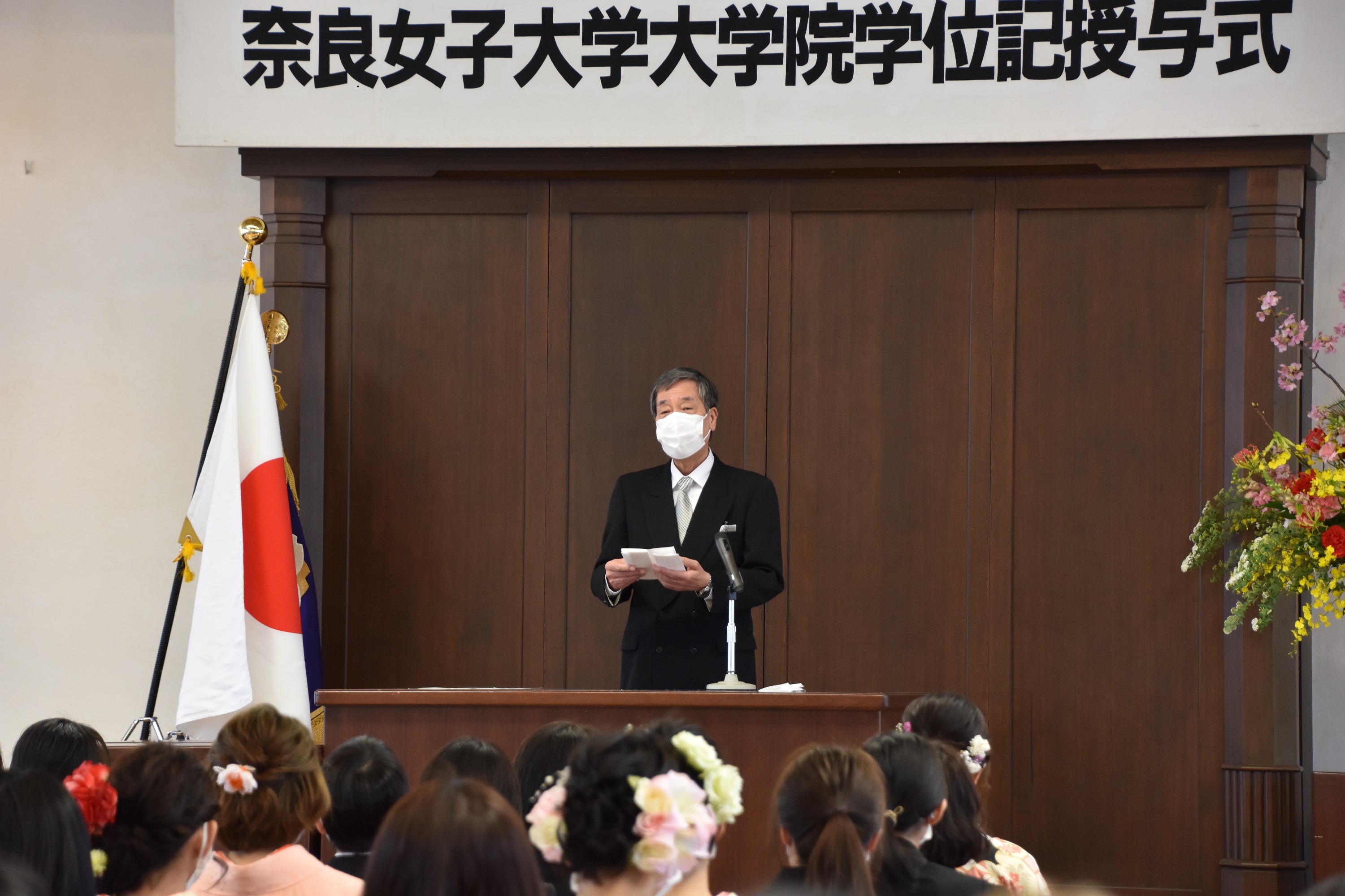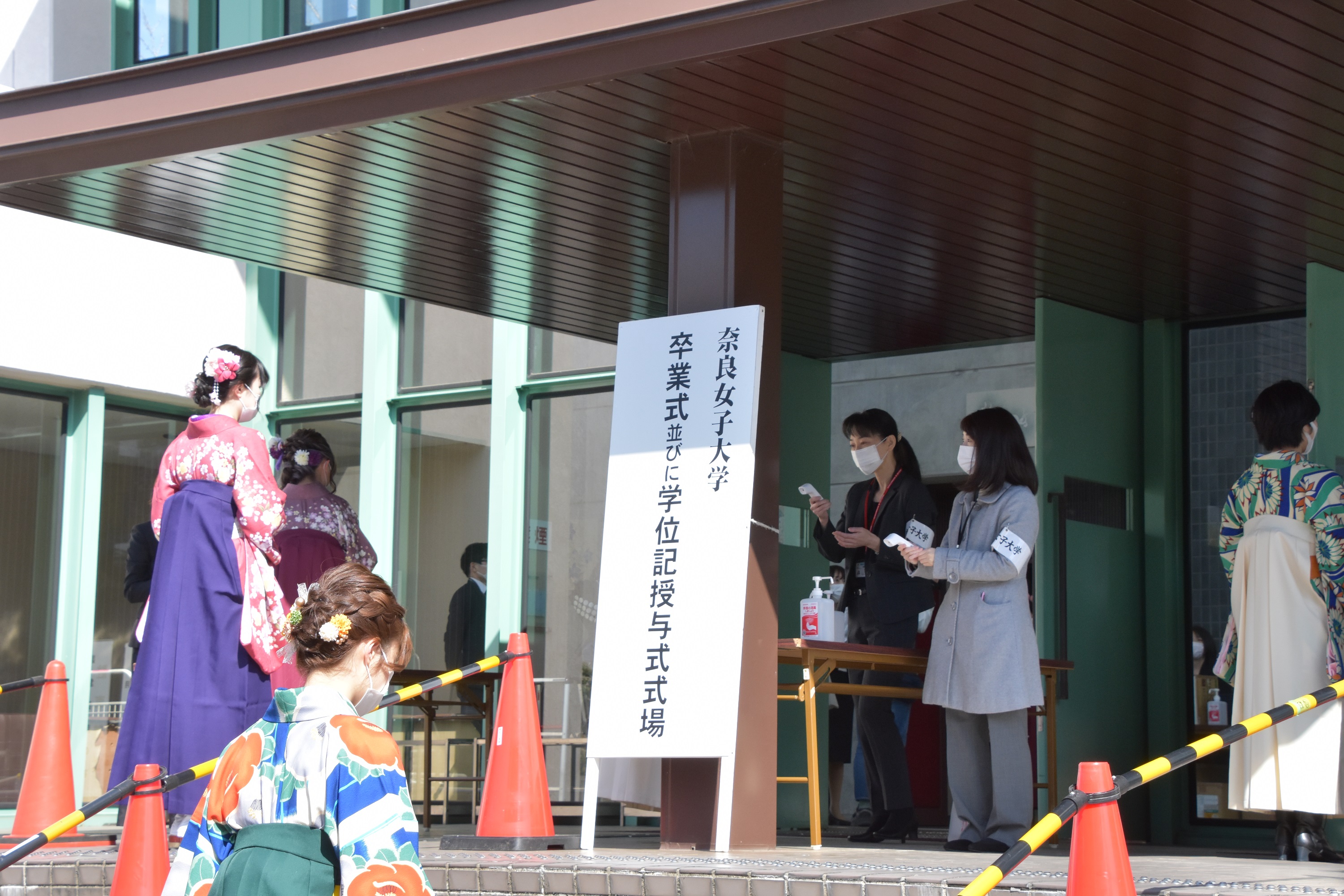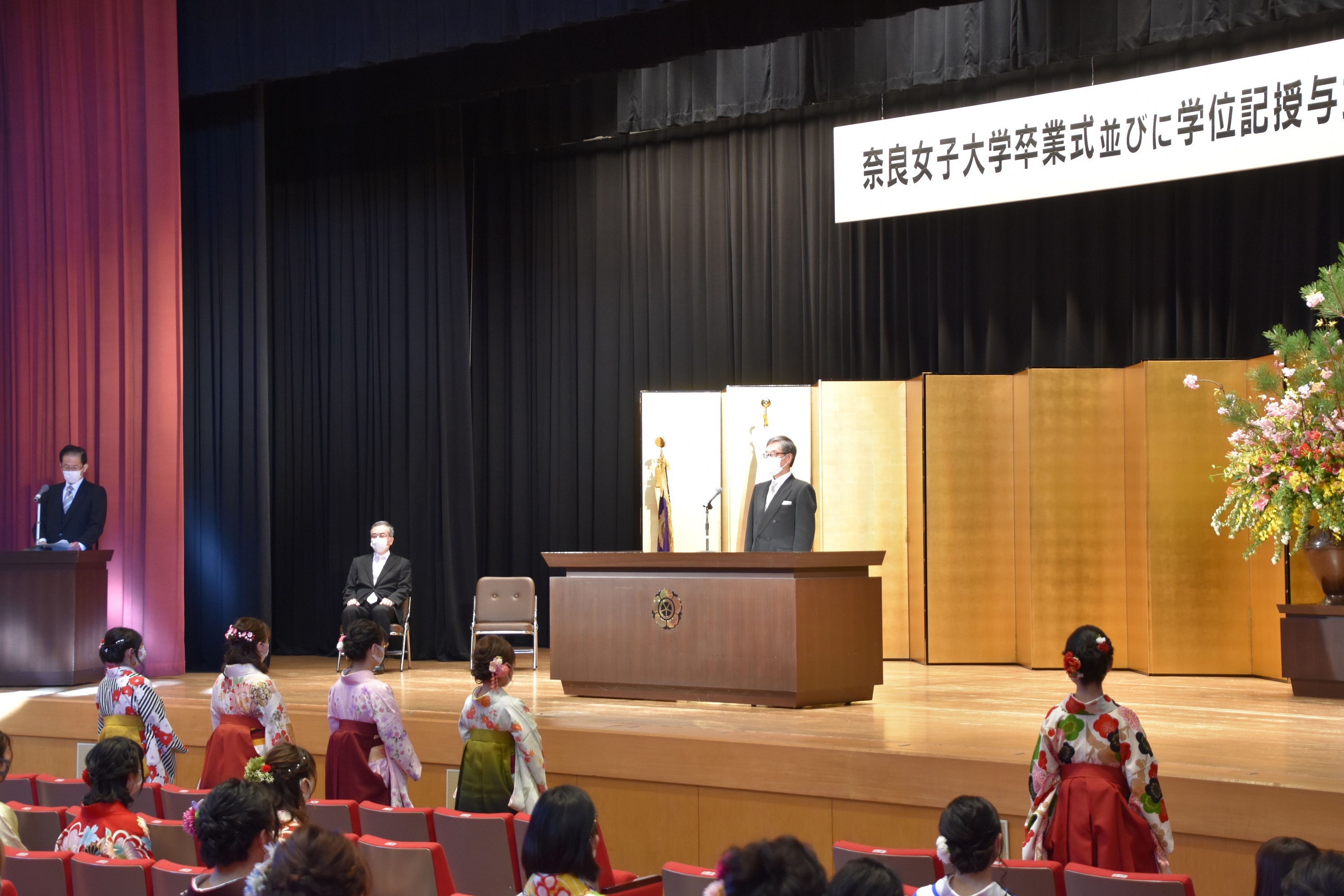 | 新型コロナウイルス感染症拡大防止のため、実施にあたっては、保護者や在学生など卒業生以外の大学構内への入構制限、学部毎の実施、式典中のマスク着用の呼びかけ、登壇者の省略など、対策を行った上で挙行いたしました。 |