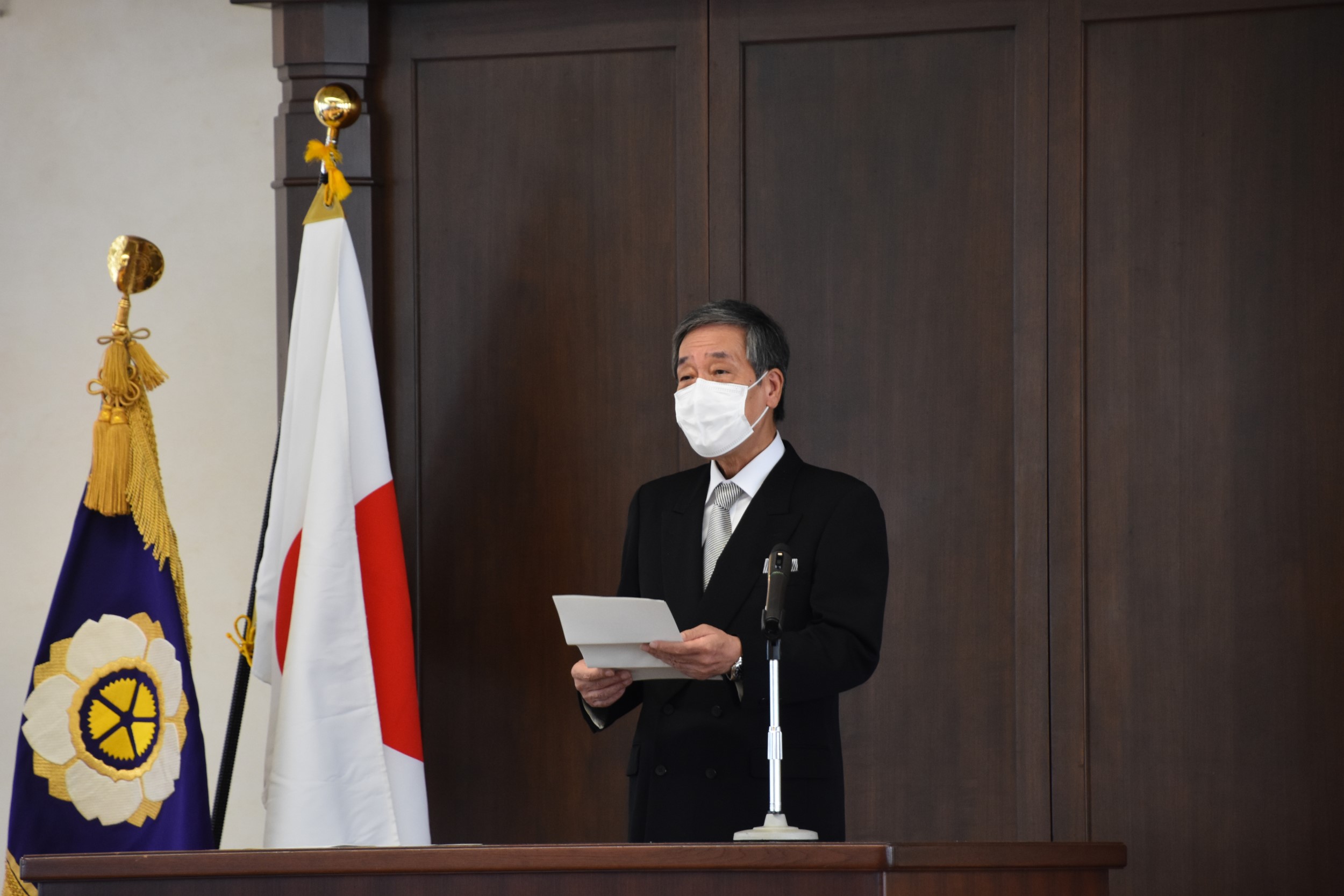 ご卒業・ご修了は、皆様の人生において幾つかある節目の一つです。節目に当たって一つお願いがあります。保護者の方、あるいは皆さんを支援して頂いた方に感謝の言葉を伝えてください。「ありがとうございました、おかげで卒業・修了することができました。」この言葉は、頂いた経済的支援についてだけでなく、無事でいて欲しいとの祈りに対しての返礼になります。昨今の自然災害や新型コロナウイルスを見ますと、無事であることのありがたさを感じます。きちんと、口に出して伝えてください。