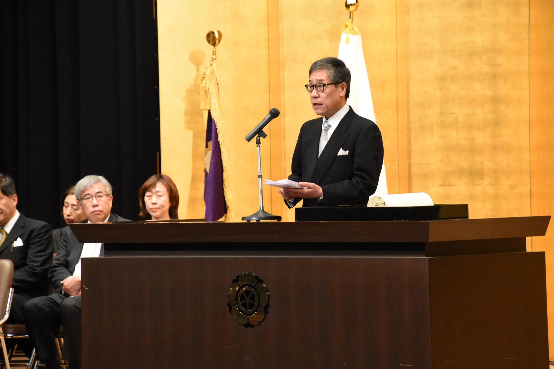今年入学の皆さんにとっては、昨年度から始まった特別な社会環境の変化が二つあります。一つ目は昨年6月に施行された18歳選挙権です。住所を奈良に移して行使してください。二つ目はCOC+という話題です。COCはセンターオブコミュニティという言葉で、地域社会の活性化を目的とした事業です。プラスがつくと、学卒者の地元定着率を向上させることを目的としています。大都会を除く全国42道府県が参加する、国家的プロジェクトです。都会と地方は対立概念ではなくコインの表裏のような関係にあります。地方が痩せると都会が痩せます。都会が痩せると地方が痩せます。この関係を深く理解した上で、自分の人生をどのように設計するかを問う、若者の人生設計プロジェクトです。真剣に考えてください。本学の学生は全国から集まります。皆さんの古里を奈良に移して考えてみてください。奈良は古代建築や仏像で世界的に有名な場所です。これらを見ながら1000年以上前の人々が願ったことを想像してみてください。