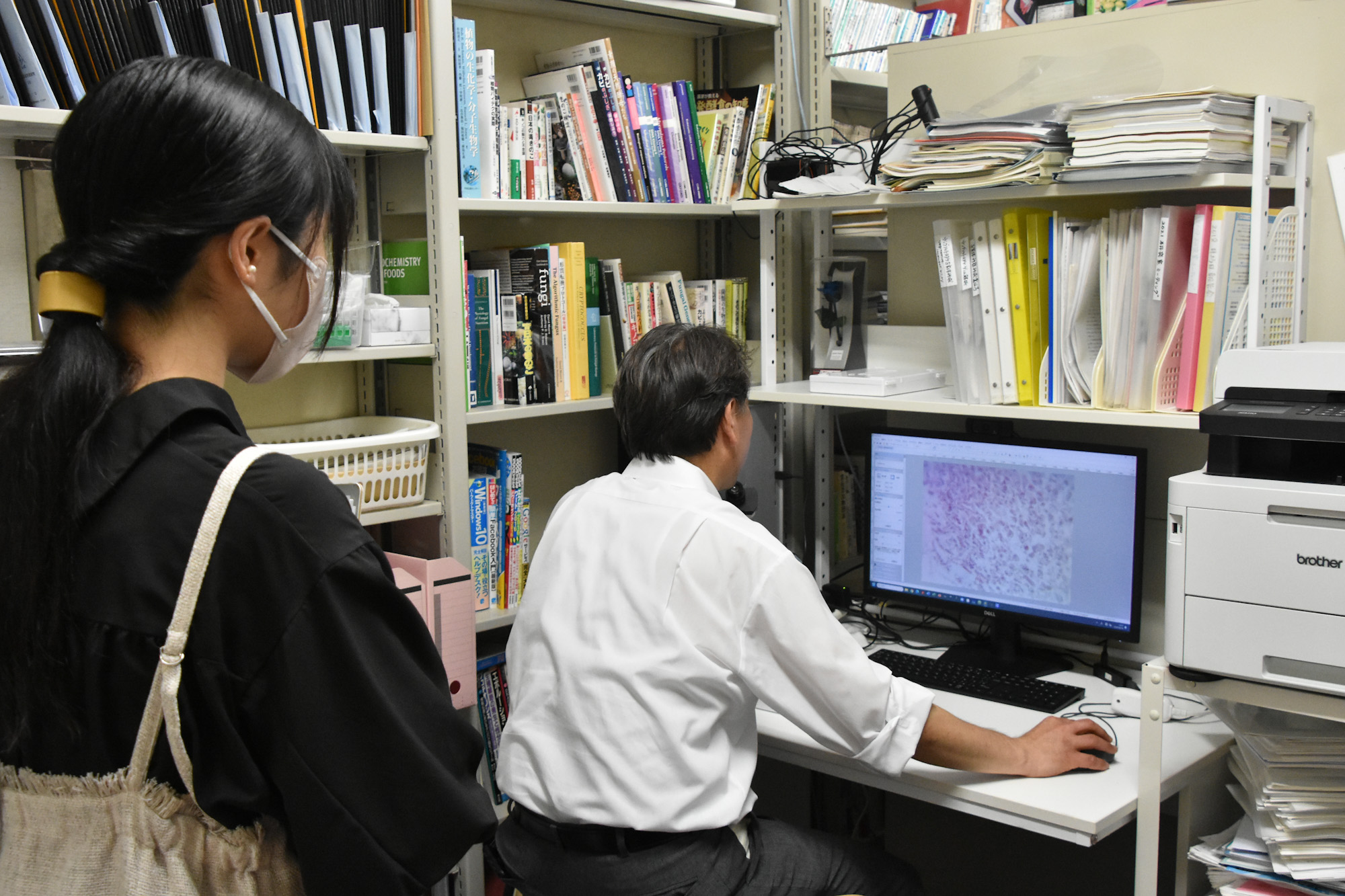 私が主宰している研究室は「生体安全学」という分野で、担当科目では主に病気のメカニズムを分子や細胞のレベルで明らかにした論文を互いに紹介し合う、抄読会(しょうどくかい)形式の授業を行なっています。論文は『Nature』や『Science』といった自然科学の分野で最もハイレベルな雑誌から選ぶようにしています。そうすることで、今現在の最先端の研究についてお互い情報交換し合うことができ、私自身、学生たちから新しいことを教わっています。